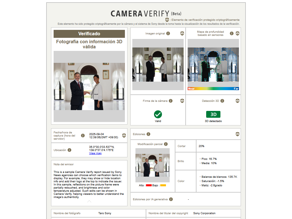 El Sitio de validación de imágenes de Sony permite verificar la hora del servidor, que el fotógrafo no puede alterar, y también permite confirmar si se ha aplicado edición mediante IA generativa. Asimismo, en el caso de vídeos de largo formato, las agencias de noticias pueden contar con una función que permite el recorte de secciones específicas manteniendo la firma digital, lo que reducirá el tiempo necesario para la verificación.