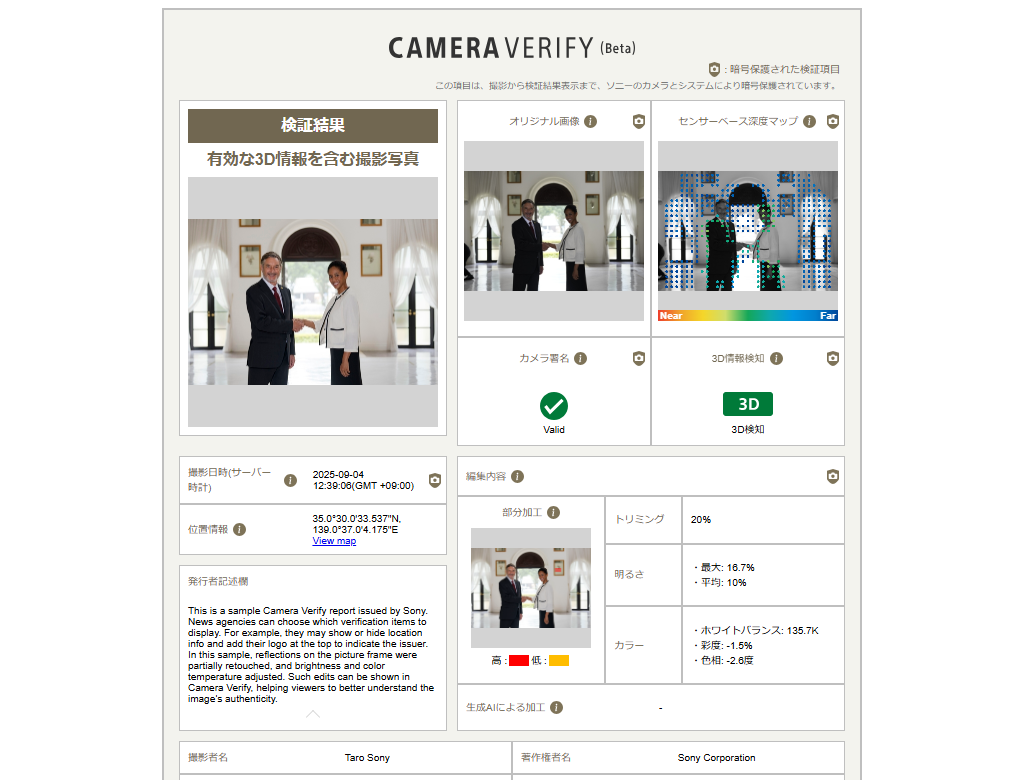 これらの電子署名やメタデータが埋め込まれた画像を受け取った報道機関は、C2PAフォーマットによる編集来歴に加え、画像がカメラで撮影されたものであるかどうか、撮影された画像が実際の3Dの被写体であるどうかなど、画像の真正性をソニーが提供する有償のイメージ検証サイトで高精度に検証することが可能です。